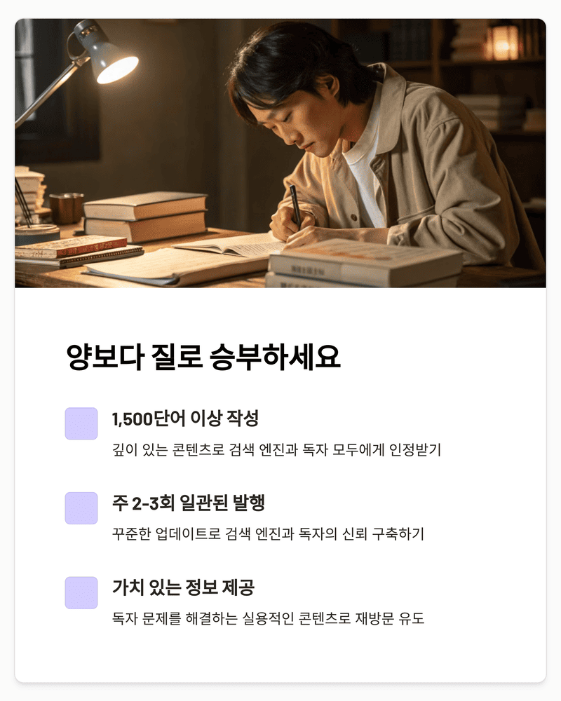 | 주 2-3회 | 품질과 양 사이 균형, 지속 가능한 일정 | 콘텐츠 축적 속도 중간 | 대부분의 초보-중급 블로거 |