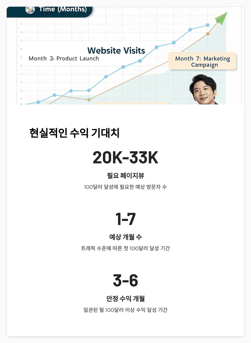 | 트래픽 수준 | 예상 월 수익 (RPM $3~$5) | 100달러 달성 예상 시간 |